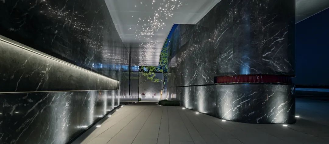 空间是多元的,温德姆大理石灰的门头,配合黑玻采用直线拼弧,勾勒出明确的入口形态轮廓,传递着沉稳与细腻。