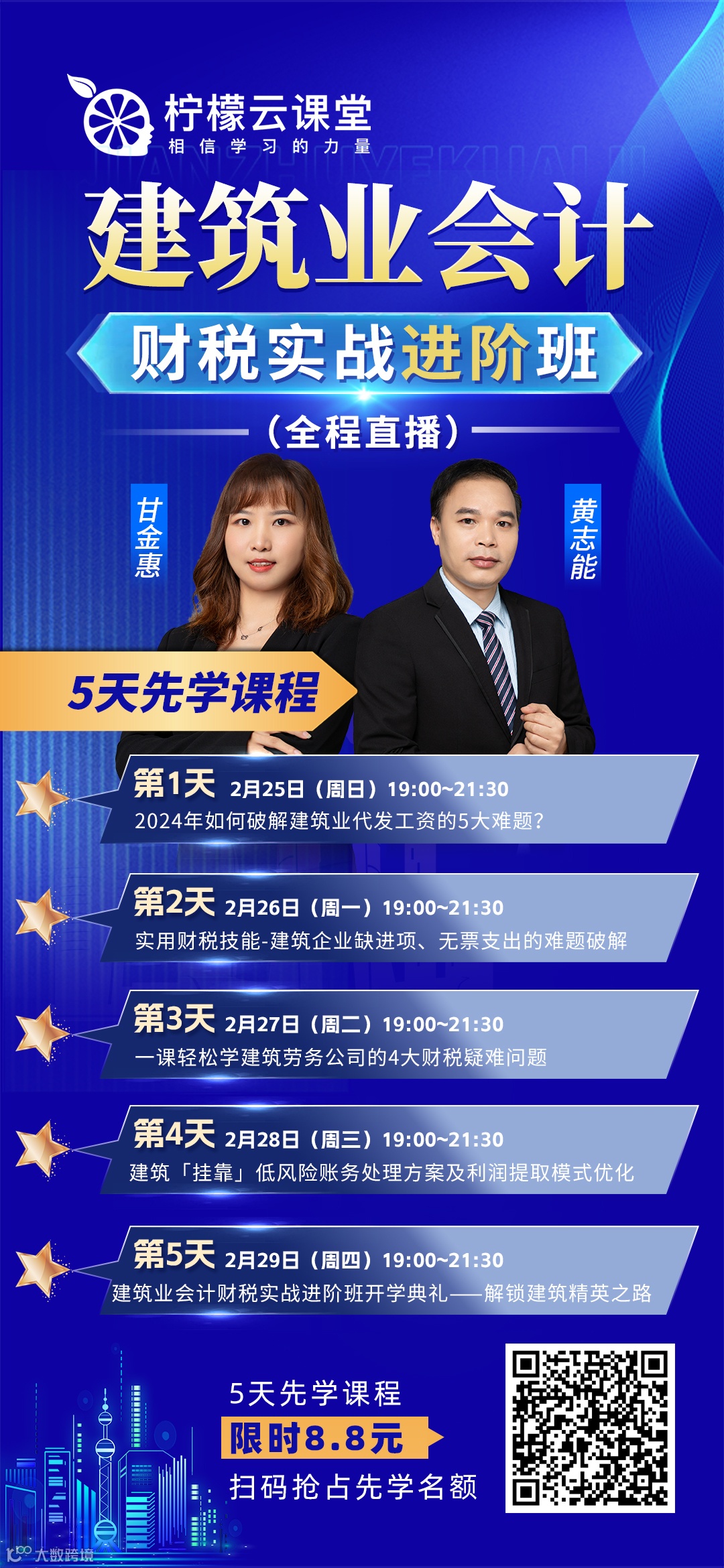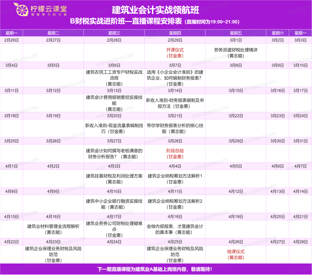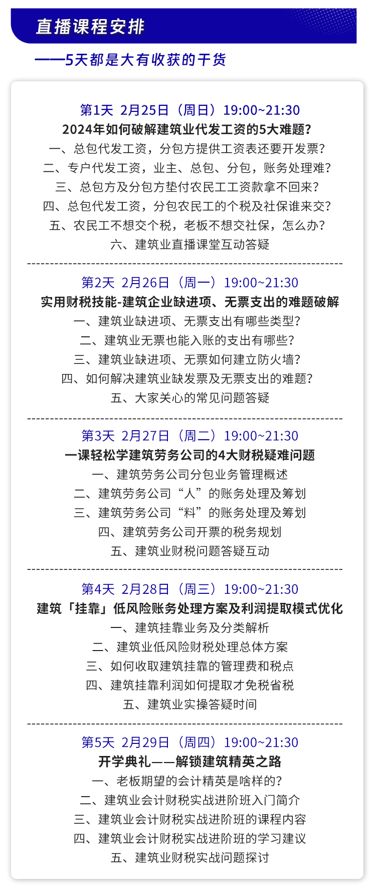 5天都是干货满满的建筑业财税高频热点直播课程!都是大家日常关注的做账报税难题!来学习定有大收获!