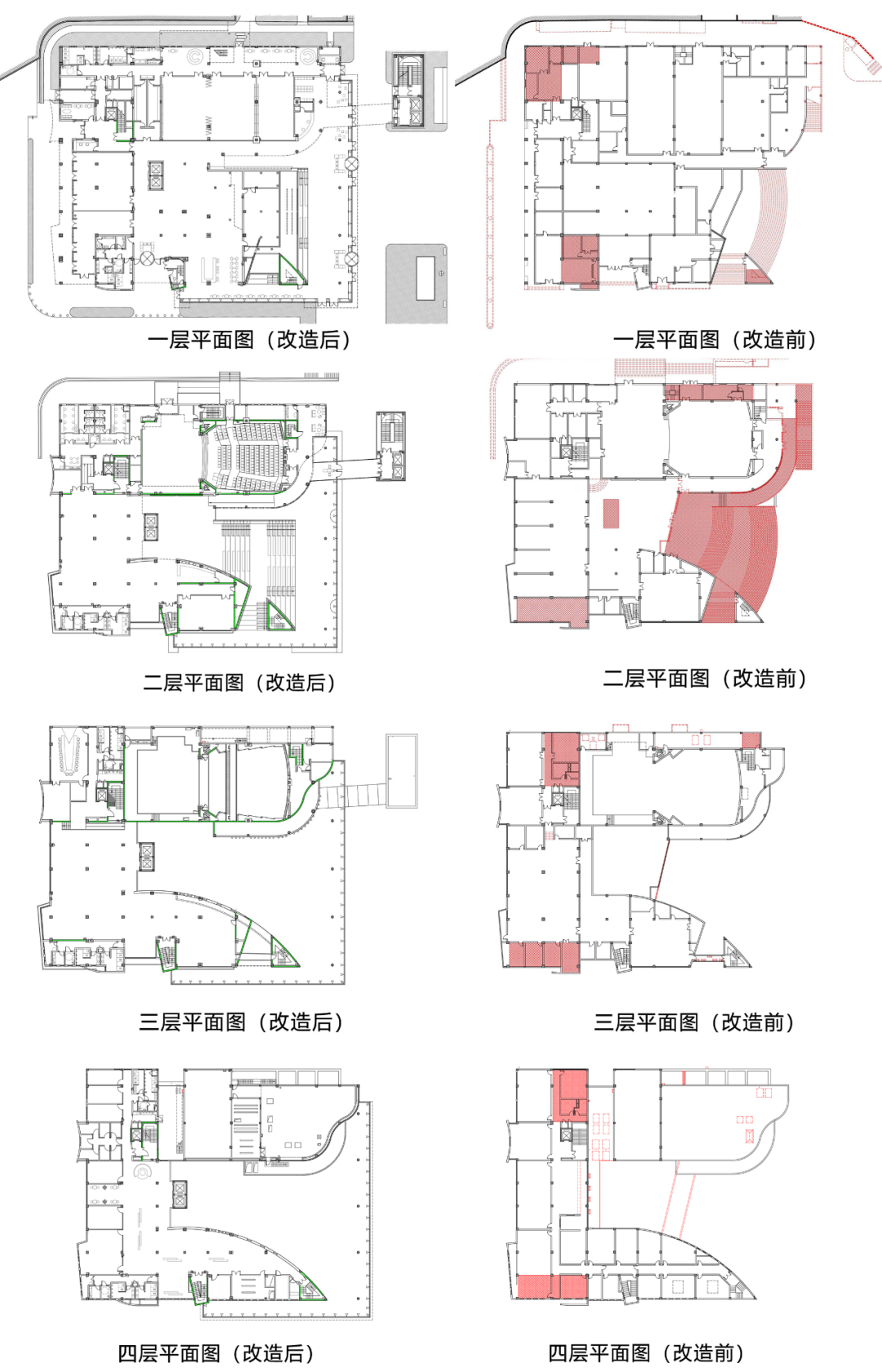 ▲ 一层内部交通 改造前后对比(绿色为人行交通空间)