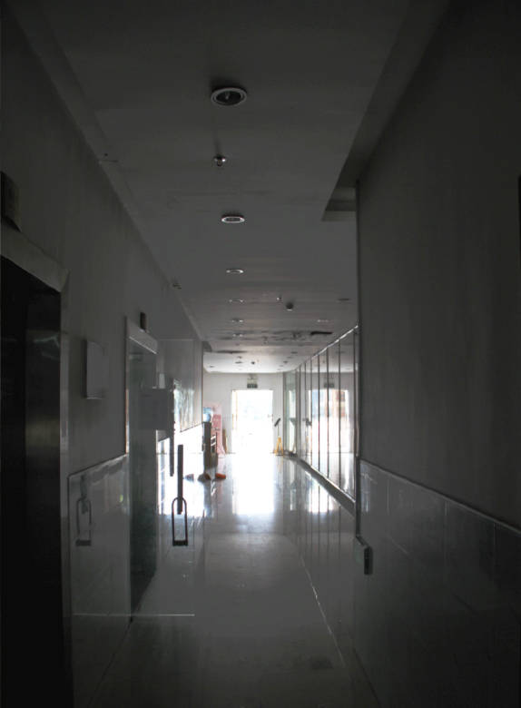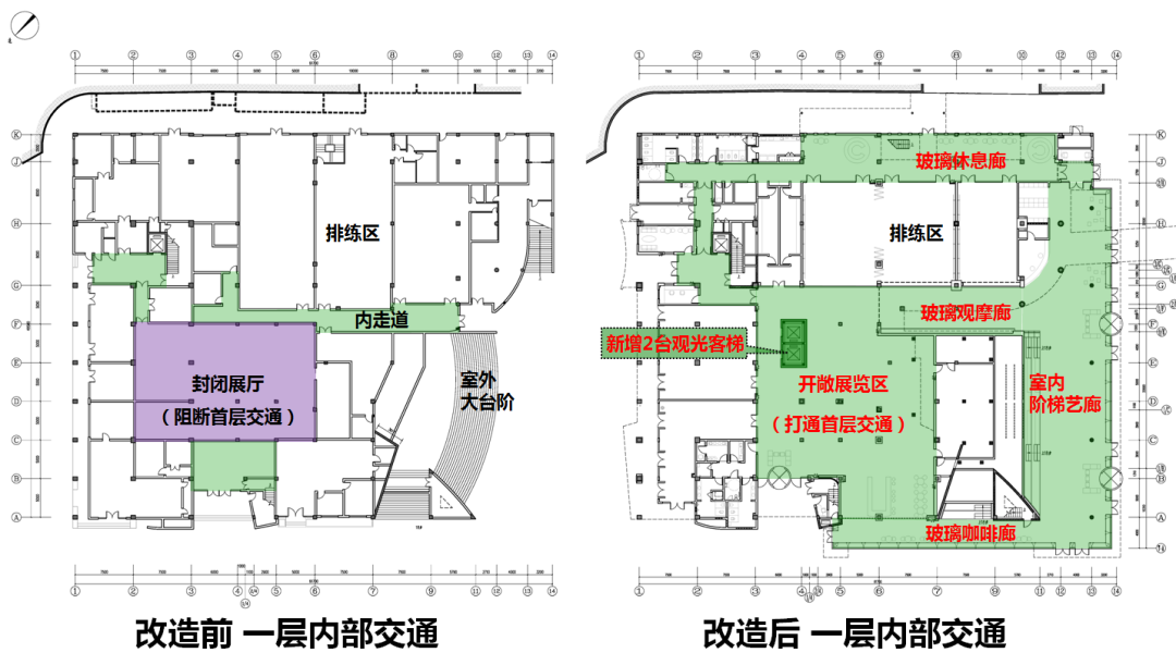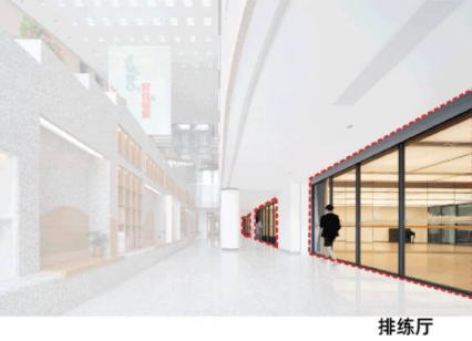 ②原一层内部交通不畅,环境闭塞。封闭的展厅阻断了首层人流,故取消展厅隔墙,改为开敞式展览区,打通首层交通;原排练区仅由一条内走道组织人流,空间狭窄,深邃幽暗,故去掉部分走道顶板,将内走道改为开敞通透的“玻璃观摩廊”,增加建筑内部的通风采光。