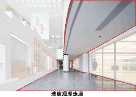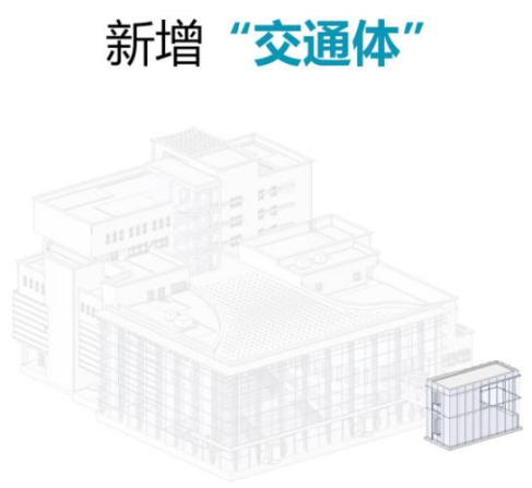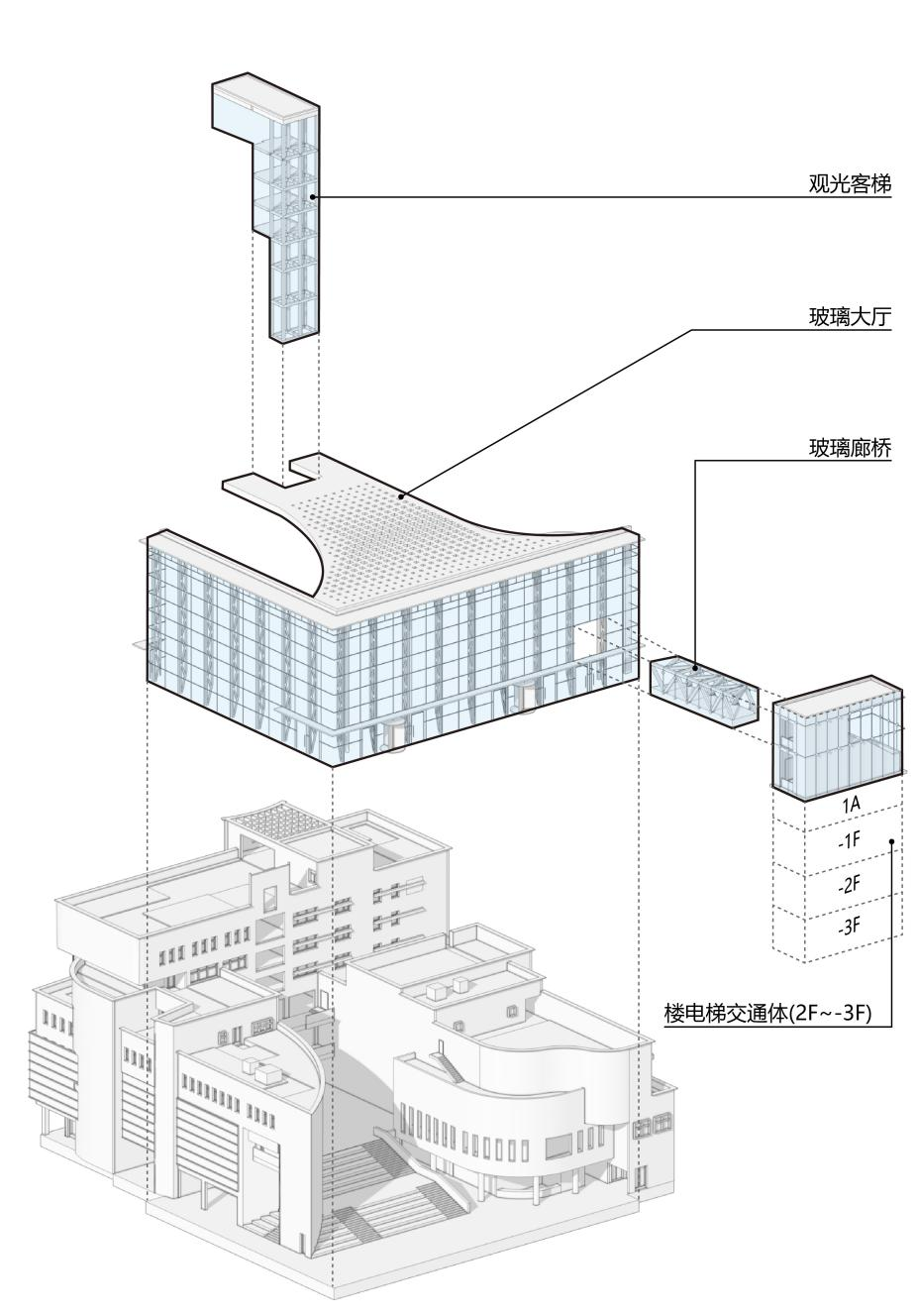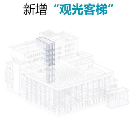 ⑤新增两个观光客梯;m新增一个前往广场及广场地下空间的两层高独立式楼电梯交通体,并通过一条架空玻璃廊桥与文化馆二层相连。