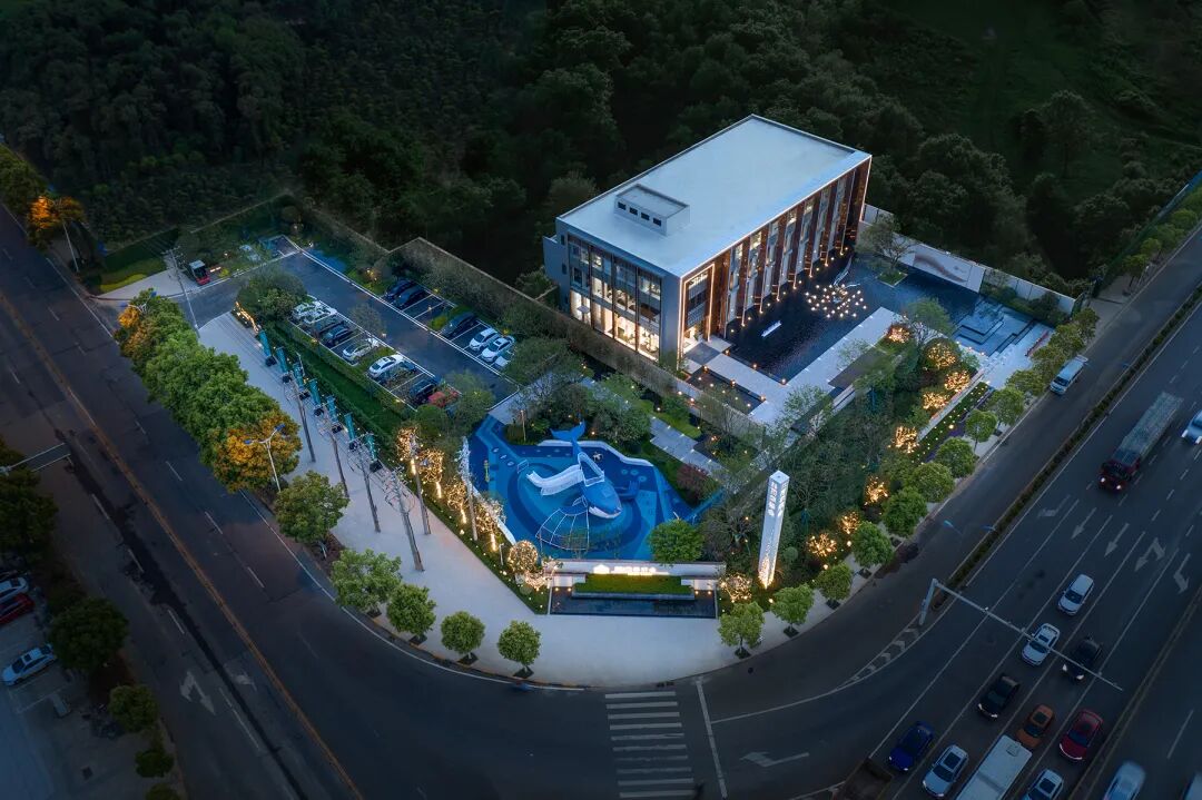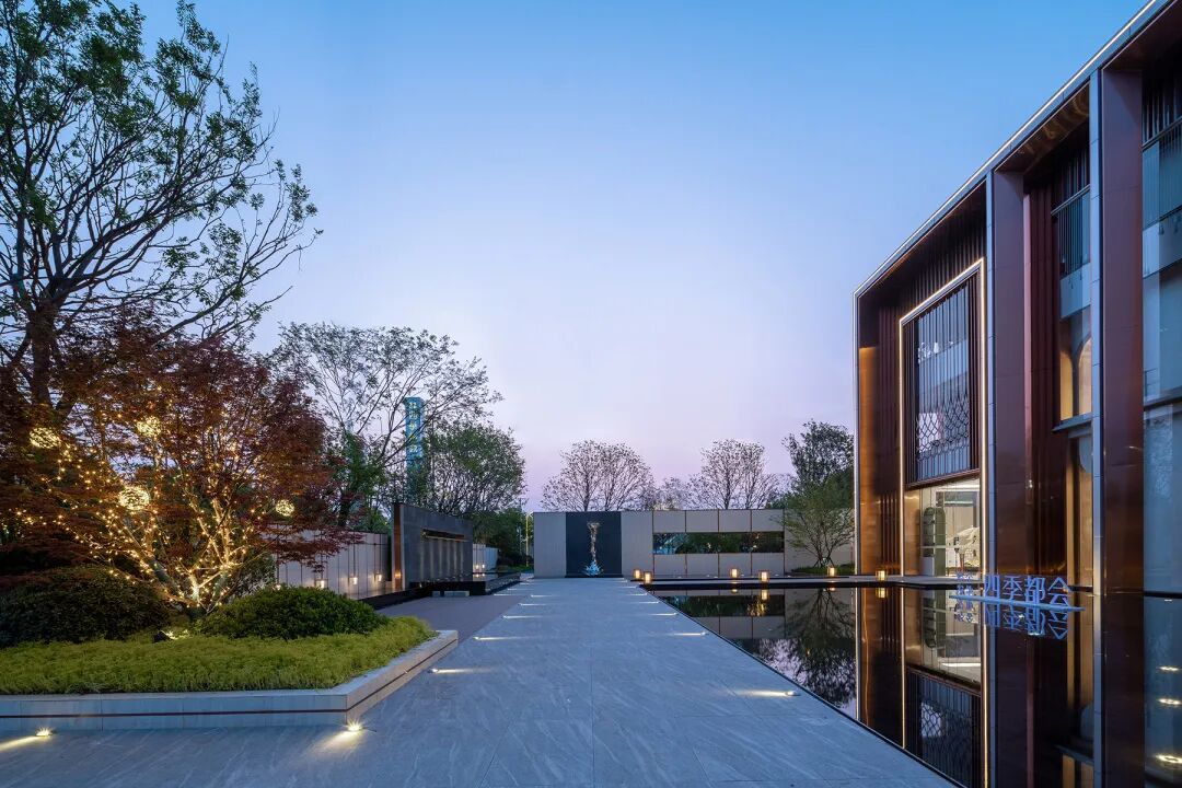 叠级水景止步于一面别具一格的特色景墙。景墙链接着叠级水景与建筑面前的镜面大水面,让水脉绵延整个场地景观,实现本案现实意义的“江林入境”。