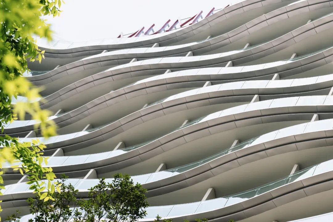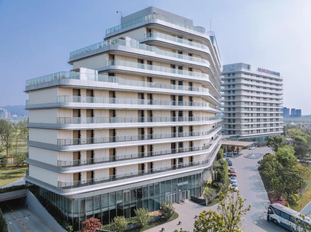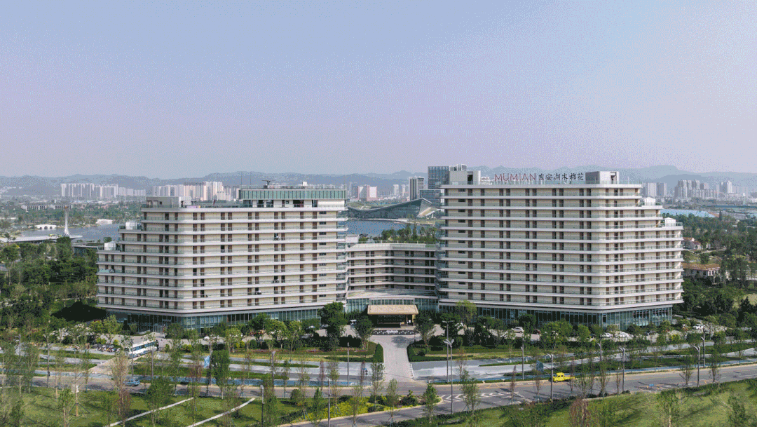 成都东安湖木棉花酒店毗邻东安湖公园及世界大运公园,采用线型空间形态,通过线型空间组织最大限度地利用周边景观资源,可远眺东安湖公园和大运会场馆,步行即可观赛事、游公园。
