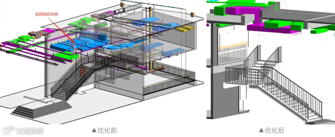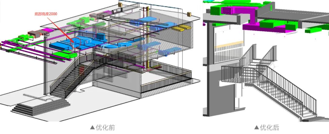 在通往包房的精装区域,楼梯休息平台上方板底净高3950mm,机电完成面要求3800mm,仅有150mm的机电空间,无法满足空调和防排烟需求。为保证精装效果,调整楼梯休息平台净高为4200mm,复核回风管尺寸,将尺寸从2000*450改为1400*320,剩余风量的风口放在其他区域布置,调整送风管位置,避免层叠布置,保证最终高度3800。