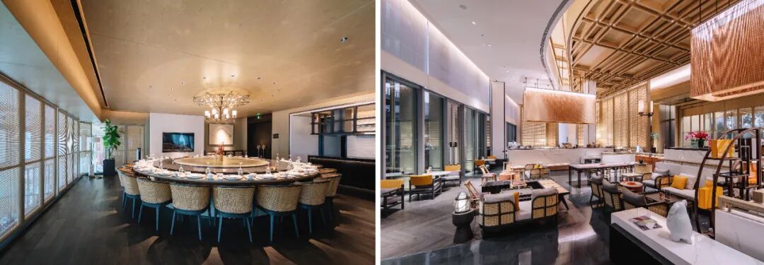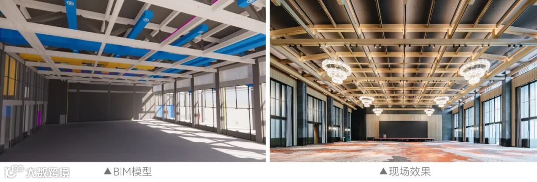 在宴会厅的设计中,为了保障精装效果,基于梁底无机电空间的情况下,利用可视化的优势,通过桁架有限的三角空间消化所有机电走管,提升净高450mm以上。