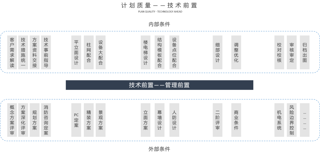 在项目传统设计过程中,由于精装设计相对滞后,但其需求往往又会给项目带来较大扰动,为了更好的保证项目效果呈现,借助BIM优势将传统的串联设计模式变为并联模式,从方案深化、扩初开始到施工图阶段,整合方案、施工图、内装、景观、幕墙等各设计主要信息,前置需求;同步开展实现提效目标。