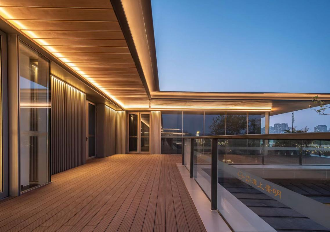 建筑室外吊顶采用桦茶色木纹铝板和超白高透落地玻璃窗的碰撞营造了一种漂浮感,人们身在书阁中,意在园林里。