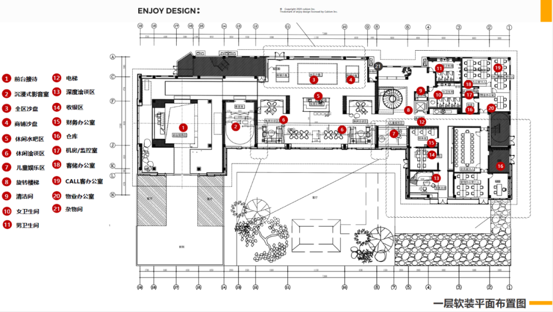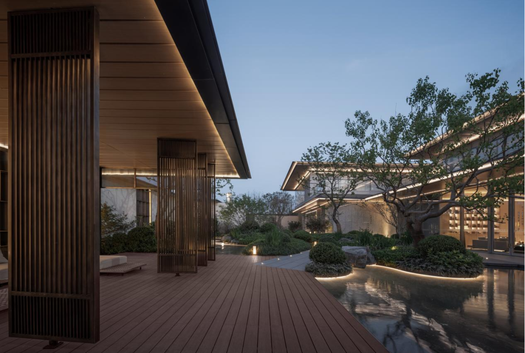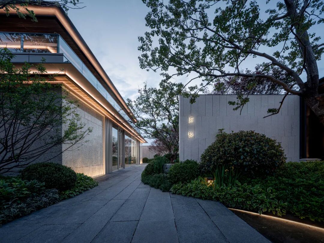 穿过洽谈区,步入山水景墙围合的茂林空间,为建筑的呈现做出铺垫。园景打造了一个宁静的空间,让人仿佛置身于园林之中,增加生活气息。