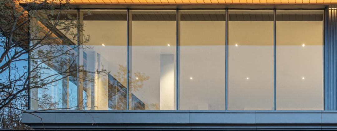玻璃幕墙由中空玻璃暖边条和玻璃交界处硅酮结构胶所形成的黑边,由竖向折形内凹金属嵌条进行遮挡遮盖,保证近人尺度的精细度。