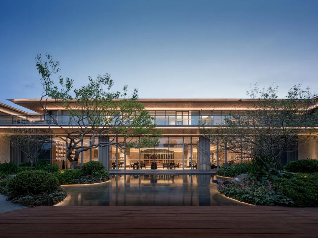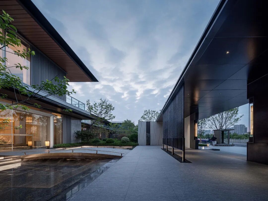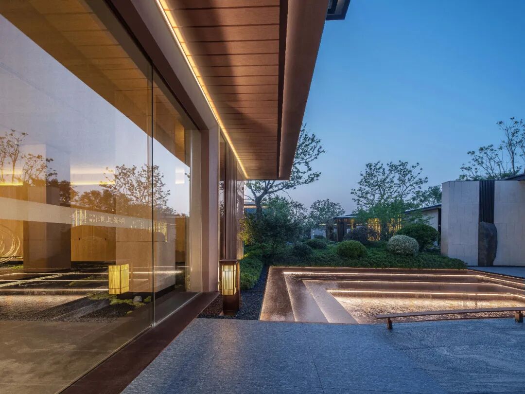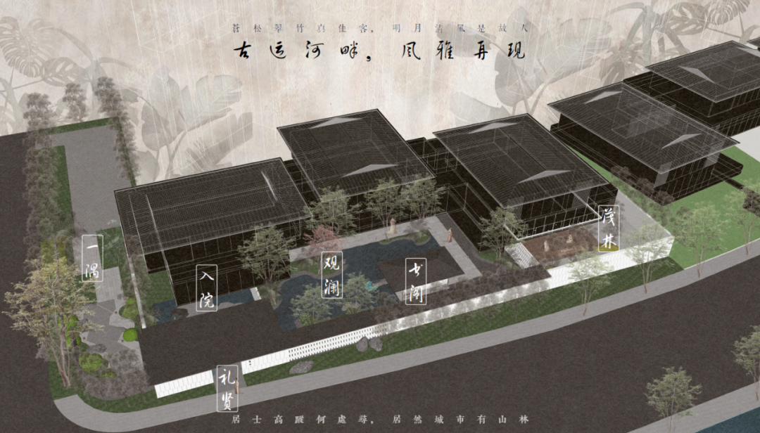 淮安有“四水穿城”之称 , 方案融入淮安水文化,将前场设计为水庭院,贴合本土化特征。空间布局上借用中国古典园林一步一景的造园方法,传承中式传统宅院的空间特征,打造四进院落的空间礼制,以雅致五景营造清流名仕的府苑景园。