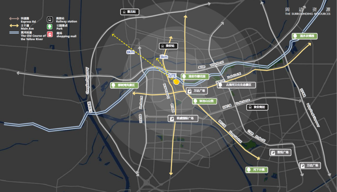 项目位于江苏省淮安市清江浦区,承德北路以东,圩北路以西,健康东路以北,场地北侧为黄河故道,与淮安市樱花园隔江相望。项目周边有大量住宅区,且位于城市主次干道交汇处,能够吸引较多人流。