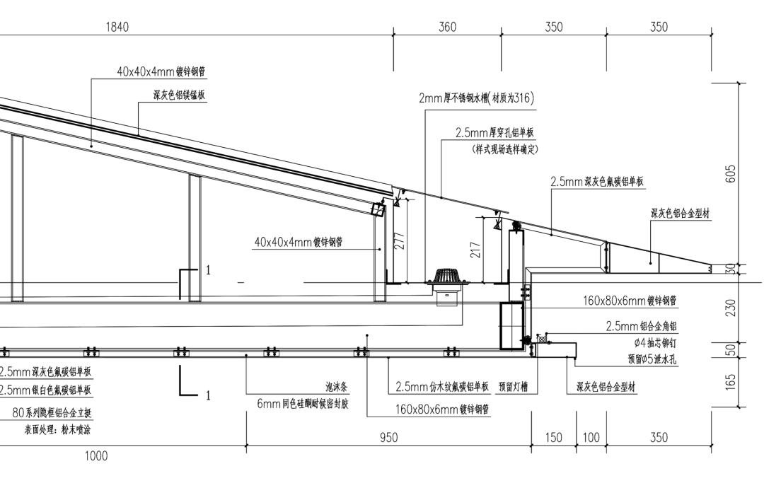 ▲挑檐外侧开模定制6米通长型材,减少分段,提升挺拔度和精致度