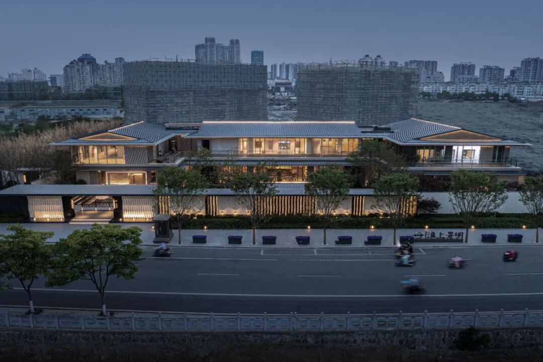 结合独特的设计,把灯槽藏在挑檐的线脚中,打造出夜间售楼处见光不见灯的效果。