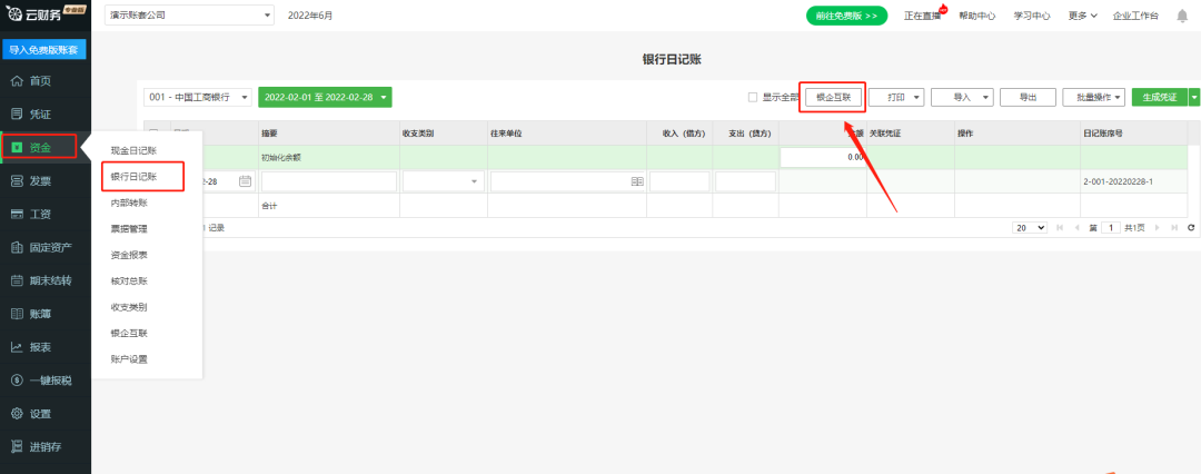 1.点击【资金】-【银企互联】进入或点击【资金】-【银行日记账】-【银企互联】也可进入