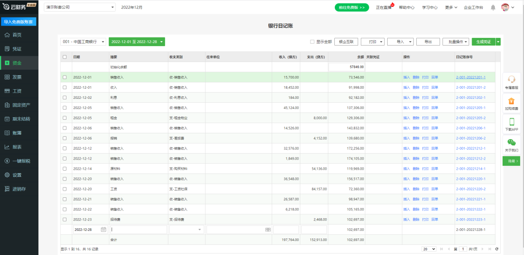 银行账户发生一条转账记录,柠檬云财务软件上就会同步到该条记录,并智能生成出纳银行日记账!还可以将出纳账一键批量生成会计凭证!