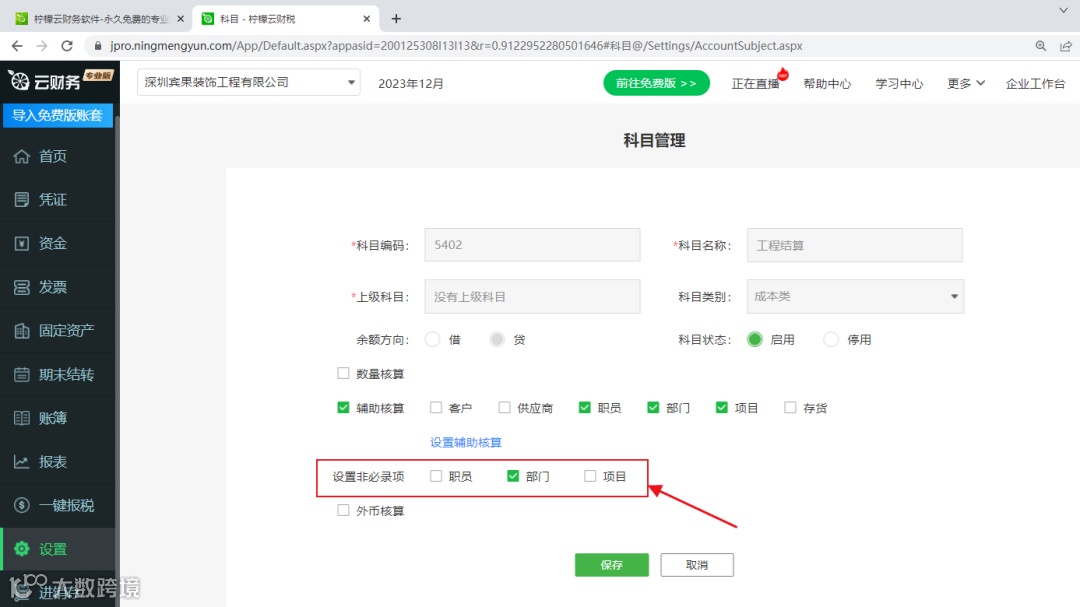 并且,对某个科目设置辅助核算以后,可以选择该项辅助核算-设置非必录项,这样更灵活的使用