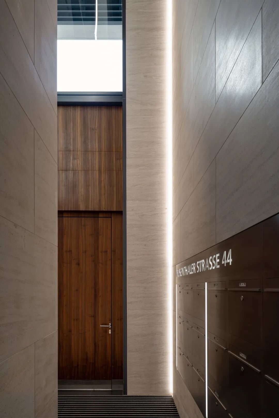例如,43号房屋的垂直立面采用了灰色的Kohlplatter贝壳石灰石。Kohlplatter是一种来自巴登-符腾堡州Kirchheim附近的天然石材,具有独特的锈棕色大理石纹路。这个立面由支架和半圆形壁柱条衔接起来。从二楼开始,落地窗上安装了棕色的粉末涂层钢条栏杆。44号房屋的外墙是由来自葡萄牙的浅色水平带状天然石材制成的,也是垂直结构的,但这次只使用了支撑物。
