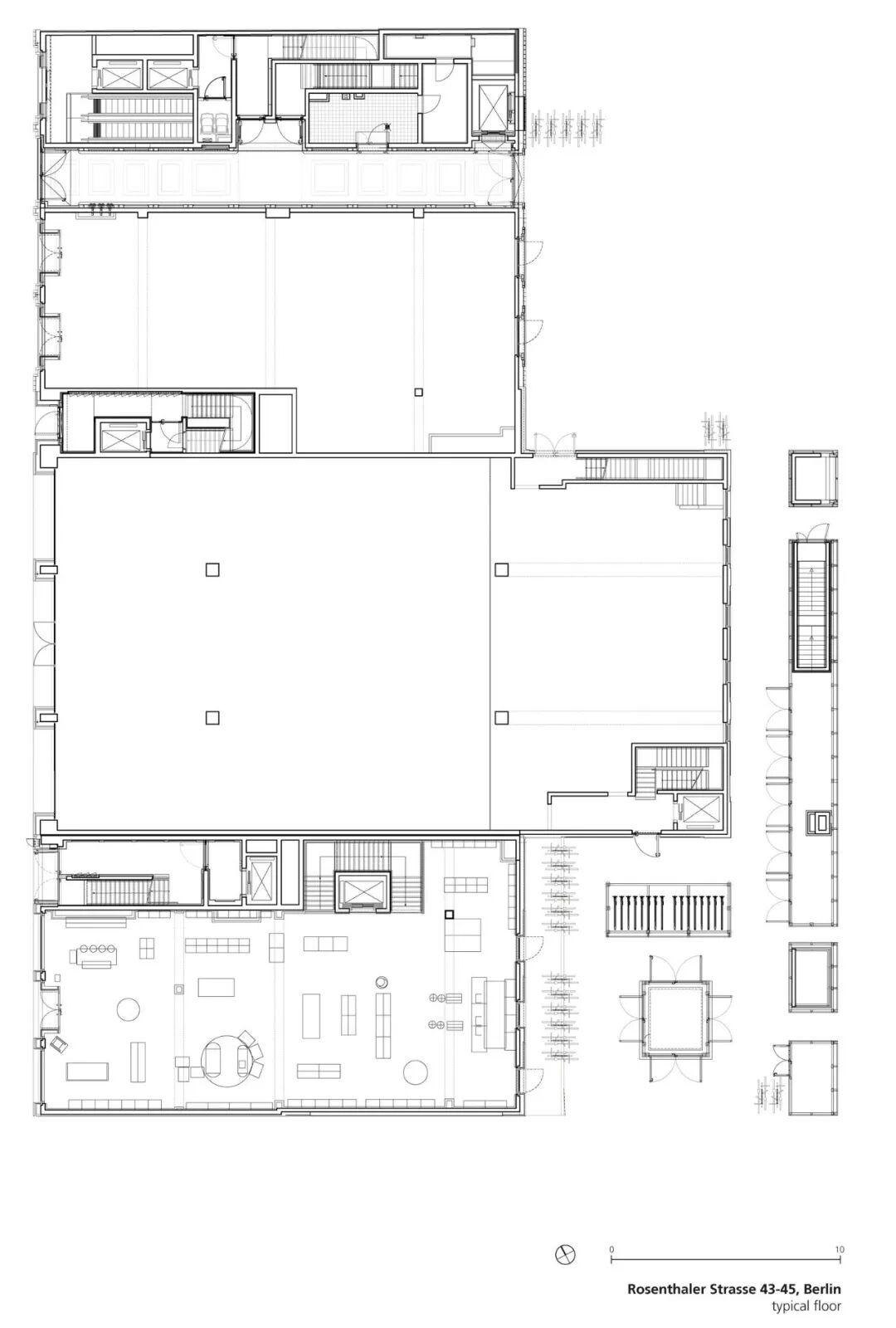 在罗森塔尔大街(Rosenthaler Strasse)43-45号,正对着哈克舍宫(Hackesche Höfe)的新艺术风格建筑群,一座由三部分组成的现代化新建筑已经建成,采用了钢筋混凝土结构。它有地上七层,地下两层,总建筑面积为15,000平方米。它继承并补充了周围居民区的住宅、商业和办公功能的组合。这三座建筑不同的、细致的立面是对建筑场地的历史分割的直接参考。