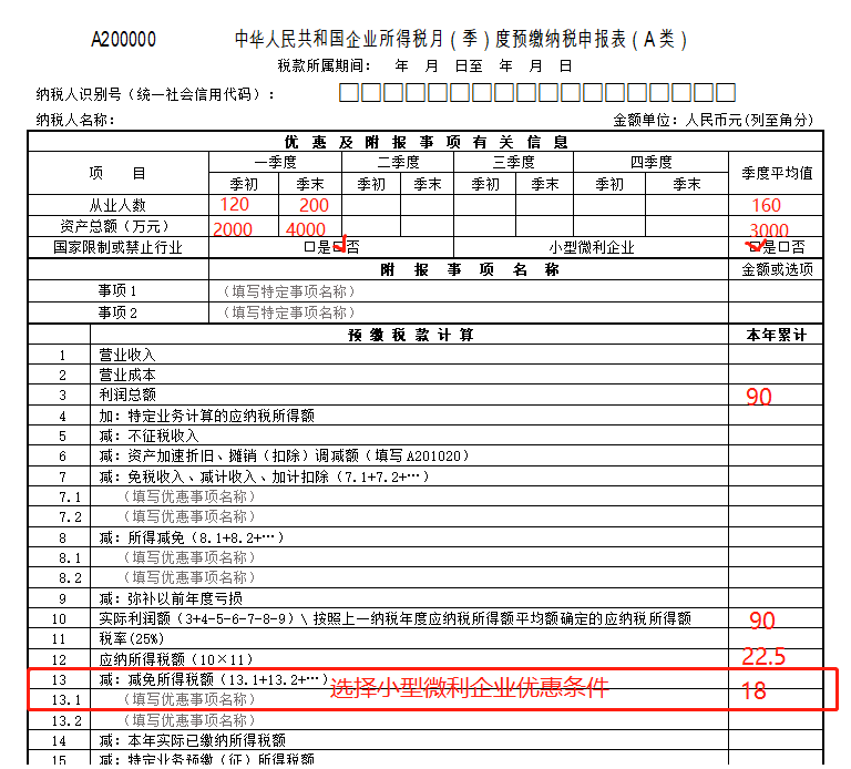 A企业2022年成立,从事国家非限制和禁止行业,2023年1季度季初、季末的从业人数分别为120人、200人,1季度季初、季末的资产总额分别为2000万元、4000万元,1季度的应纳税所得额为90万元。