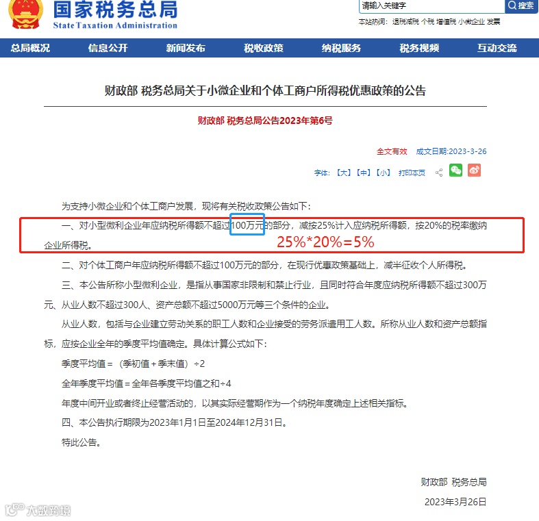 3月24日明确说明了小微企业100万以内的优惠政策会延续,但是没有说最终具体的税率是多少,就在3月27日财政部、税政司、国家税务总局发布了:财政部 税务总局公告2023年第6号,明确了小微企业100万以内的具体税率是5%。