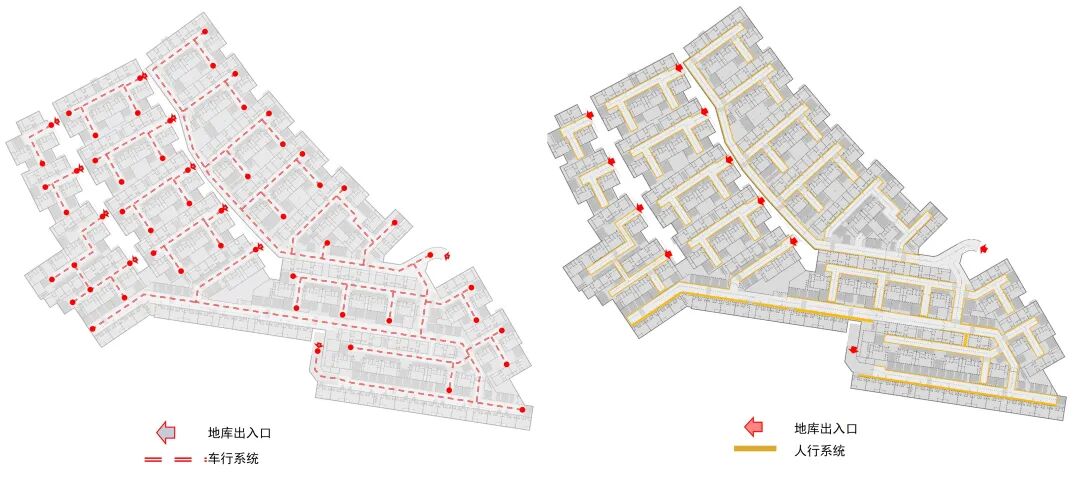不同于往期人车混行的动线规划,为了让渡更多的地面空间给到景观及庭院,本区块采用了大底板地库来解决停车及车行入户空间,于是人行之外增加了地下动线。