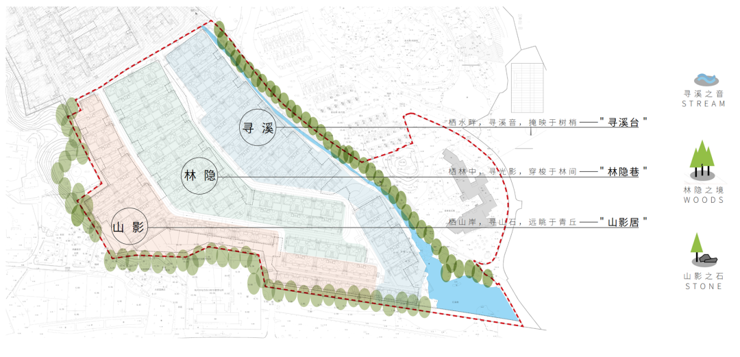 设计尊重原始山形,北部西高东低,顺势将场地分为三个台地,人行平进,车行自低处进,最东侧沿水则设置亲水平台与东侧溪涧互动;南部平缓,顺势与北部三重台地自然衔接,形成丰富的地形变化。