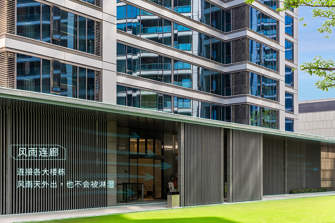 还有就是大区的风雨连廊直接连接到入户大堂的一体化设计,比如融创中心武汉壹号院的风雨连廊连通了所有楼栋的入户大堂,这样的设计打造出了具有豪宅气息的大区基调与精致的归家流线。