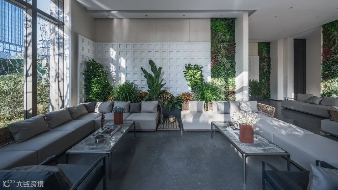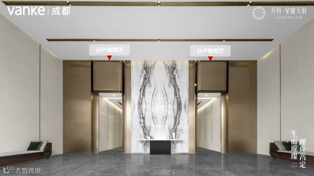 成都万科·星耀天府2号楼约9米的入户大堂,不仅做到了分户电梯厅,同层两户分别引向左右两侧,还将室内外景观高度融合,达成精致与自然的无界和谐统一。