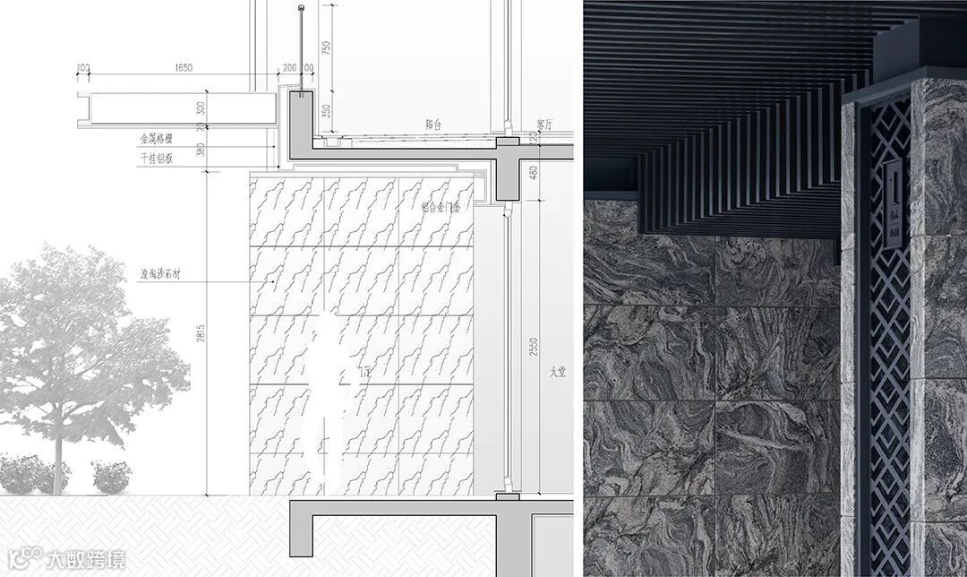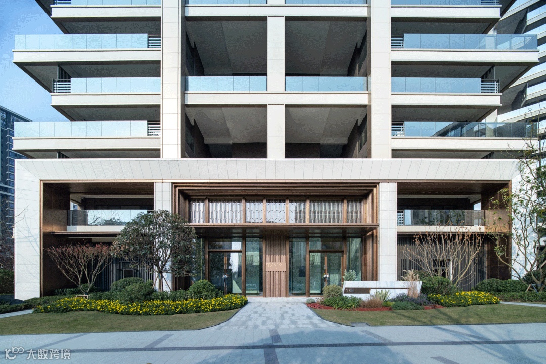 比如杭州·世茂·钱塘天誉,门头设计为了与整体外立面匹配,入户大堂的石材甄选了福建 “浪淘沙”,其纹理如大浪淘沙,写意的肌理感,仿佛看见宋人“天人合一”的精神内核;搭配着雨棚下方延展出的“V”形水纹格栅,体现入户大堂的归家尊崇感。