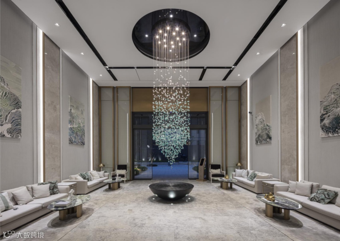 重庆融创壹号院一期首层酒店式入户大堂,挑高约4.5米,整体采用轻奢现代风格,配高定的新奢软装,以山水元素烘托典雅气质,地面采取全石材材料铺设,入户处,以灰色系石材水刀拼花妆点,集精工与艺术为一体,让归家尽显尊崇。