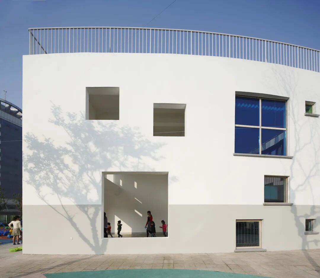 在弧形教学楼的凸面一侧,一个两层高的公共空间容纳幼儿园的主要公共入口和每个弧形教学楼的入口。这个公共空间还为不同年龄的学生提供一同玩耍的机会。教室一侧是凸面墙,临街一侧则是一组凸面曲线,这些公共立面上的曲线也是幼儿园内户外空间的彰显。