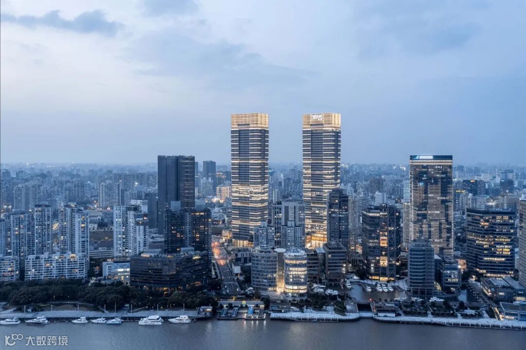 上海北外滩来福士横跨四个街区,包含两座办公塔楼,两者通过高 6 层的商业中心相连,并且可以直通TOD交通枢纽。