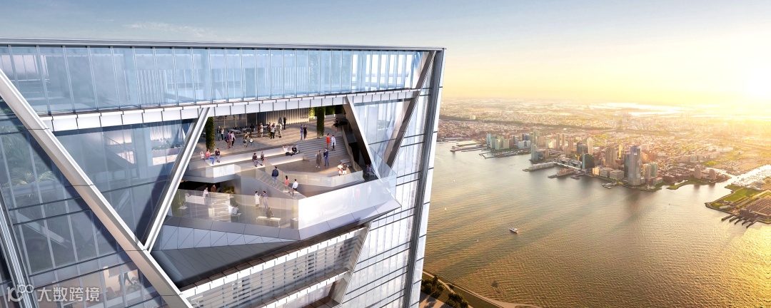 建筑拥有独特的造型,拥有层层叠退的景观露台,为建筑、景观、室内的一体化设计提供了条件;设计将位于办公和商业中间的体量设置为开放的城市客厅,通过旋转上升的步行道将人吸引到空中客厅;在同样限制条件复杂的用地项目中,该项目在保证开发强度的前提下,实现了更加多元的混合功能、更高的社区生活品质和更大的城市公共空间。