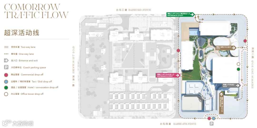 作为区域内唯一大型复合式TOD综合体项目,SIC超级总部中心包含了SIC写字楼(9.3万方),SIC65公馆(5.4万方),香格里拉酒店(3.8万方),高端公寓(9万方),LOFT(8.4万方),以及一座近10万方的shopping mall——「超深活中心 COMORROW」。