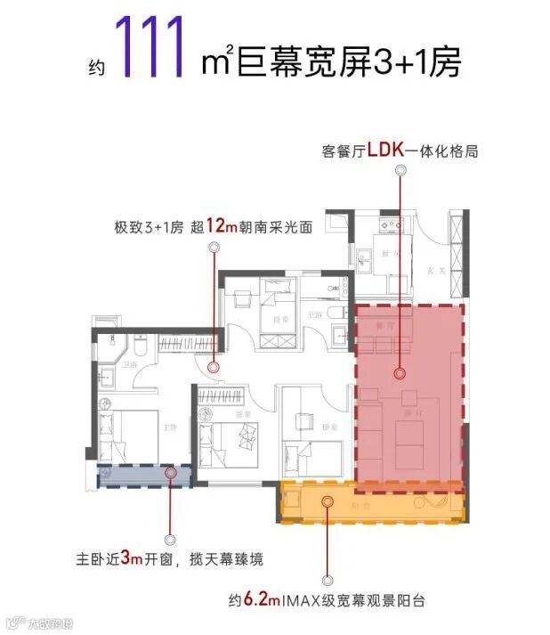 环东时代的111㎡的极致3+1房,超12m的南向开间带来无与伦比的采光面,同时具备约6.2m的IMAX观影级宽厅和餐客厅LDK,一体化格局。