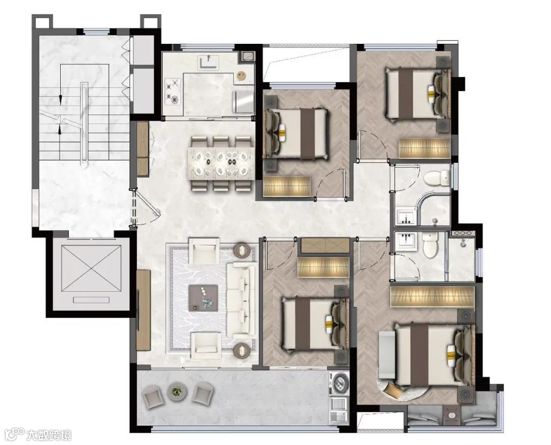 四房设计给予居住者尊崇仪式感,有孩子的成长天地,有父母的私密空间,也有老人的颐养居所。