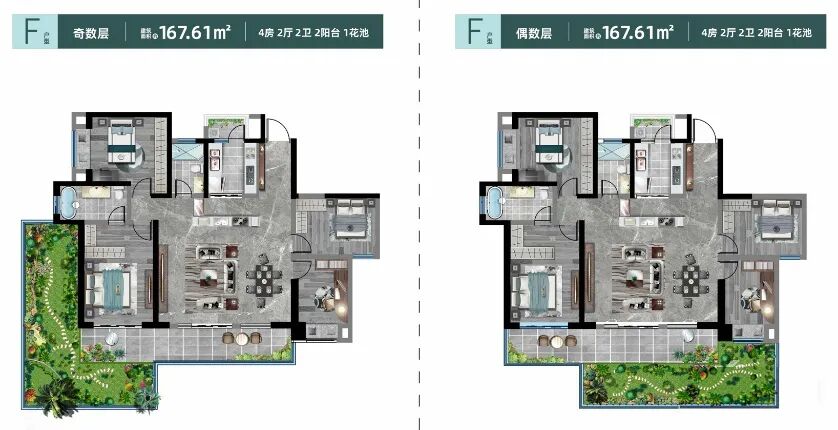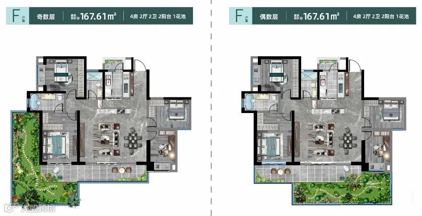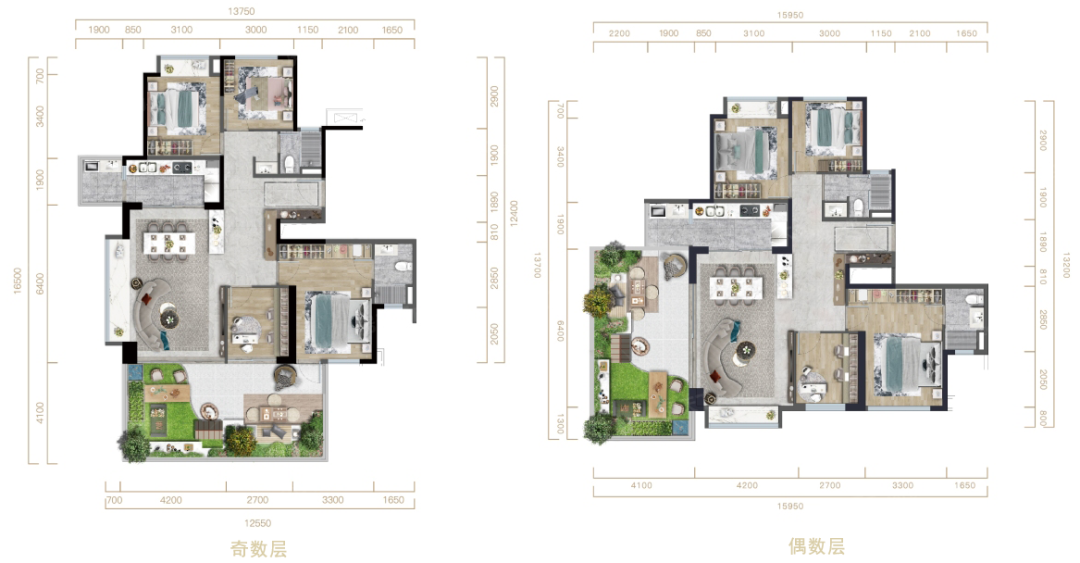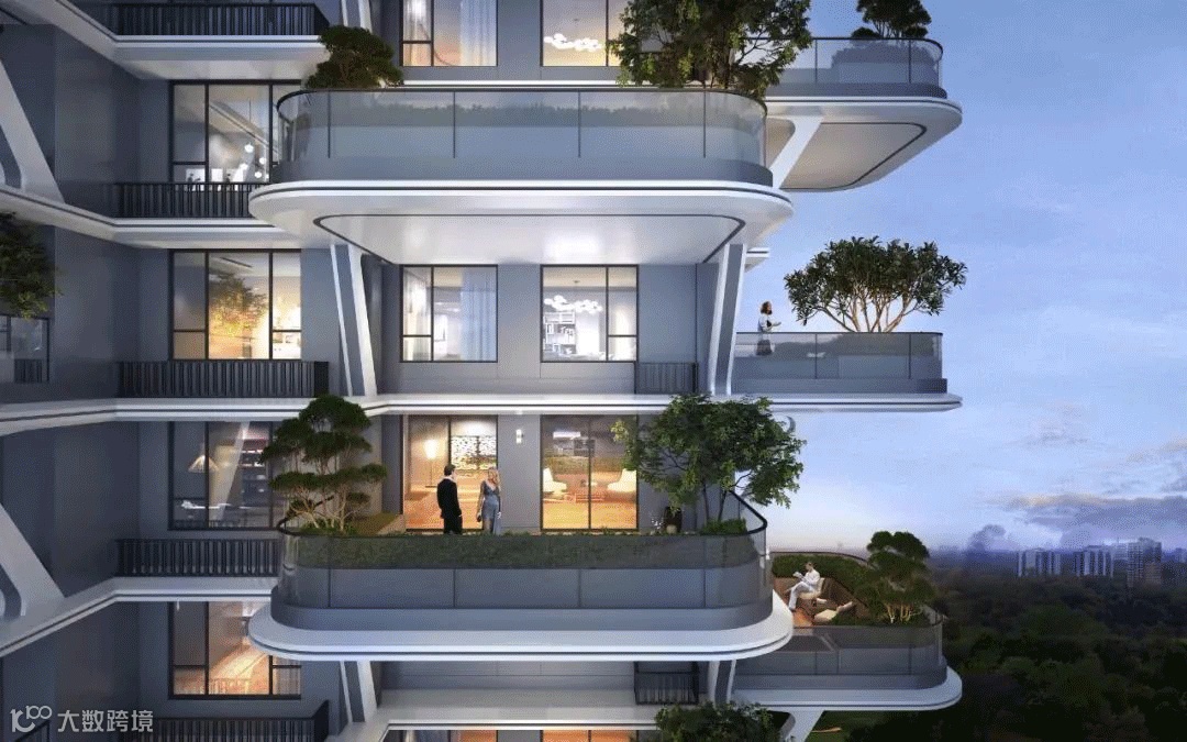 整个户型空间都被绿色包围着,每一个空中庭院的造型都不一样,做到了层层有园林、户户有庭院。