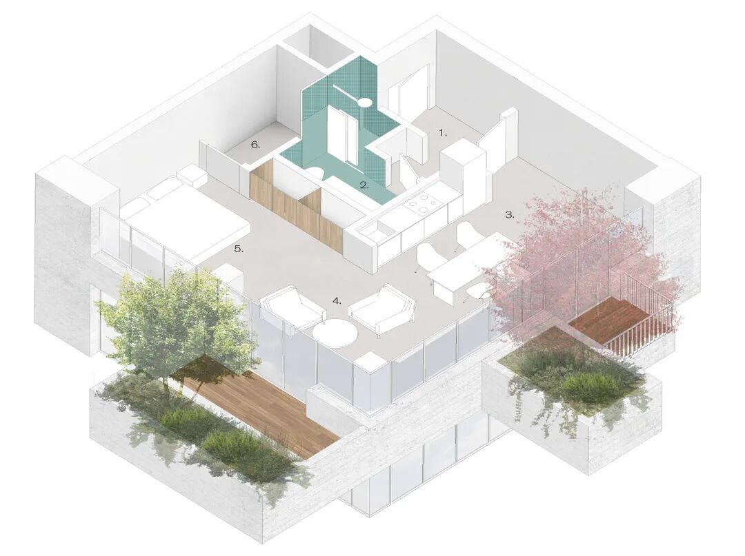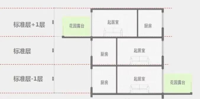 为了实现空中庭院与客厅的对位互通,所有户型的客厅随露台进行空间换位,进而实现每个户型的客厅与露台真正融为一体。