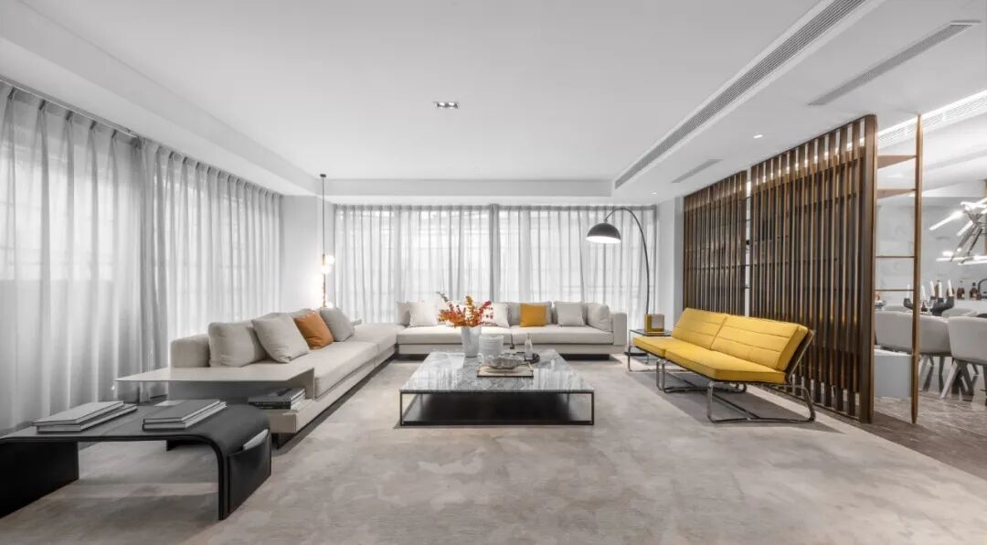 空中花园的转角错层设计,摒弃南北错层的过时做法,采用相邻面的上下错层。270°广角视野,不仅能无遮挡的俯瞰双中庭,还让更充沛的阳光进入客厅。