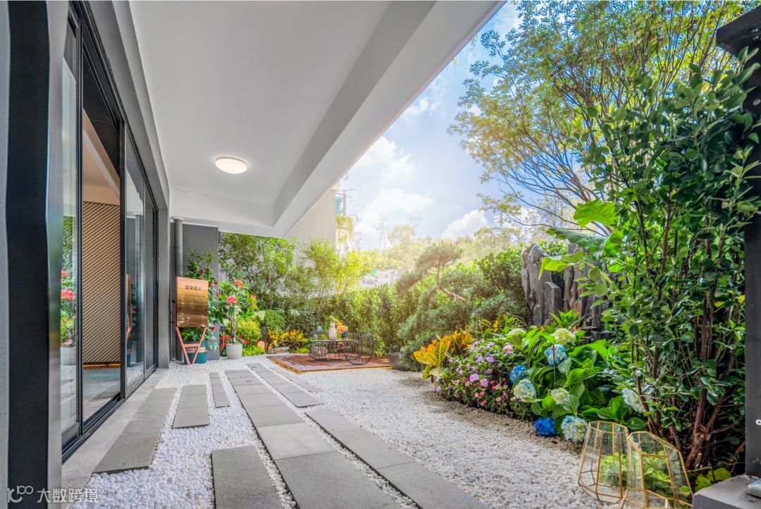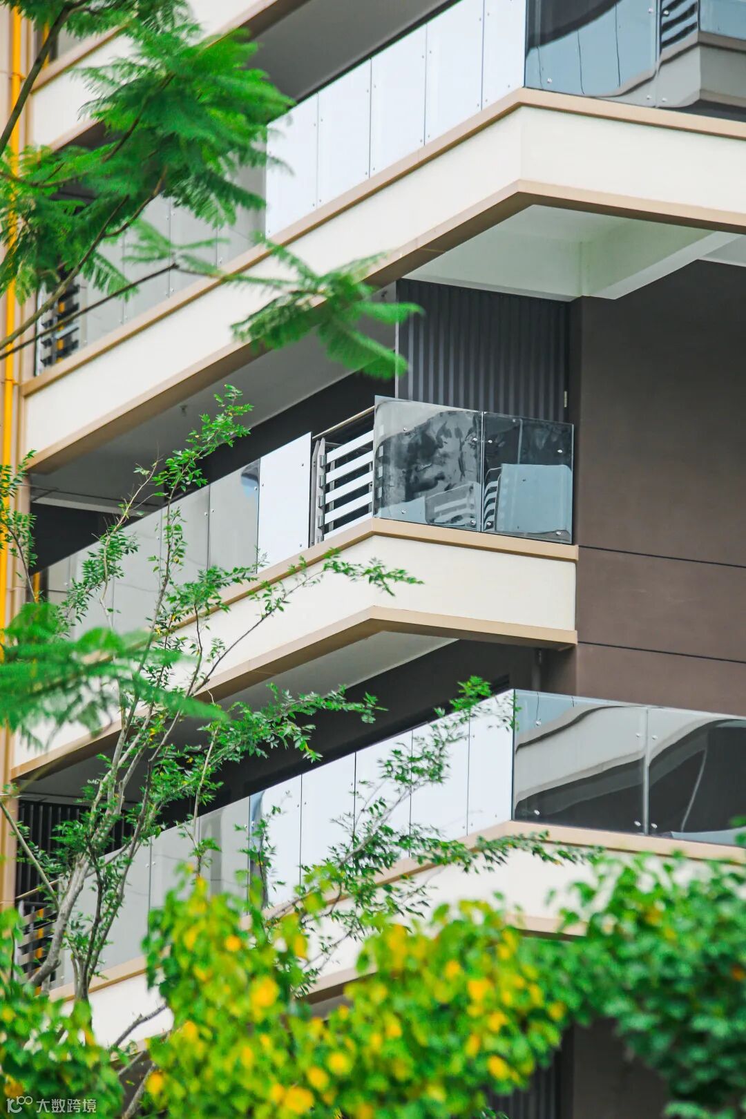 以大面积蓝灰色玻璃栏板、错位挑空露台为整体设计元素,约270°环绕阳台设计,利用双层空间打造约6米半开放式挑高露台,大尺度挑高正好在垂直方向上制造了一个巨幅通透界面,除了可以让树木尽情吸收阳光雨露,亦能大幅提升房间内的采光、通风效率。