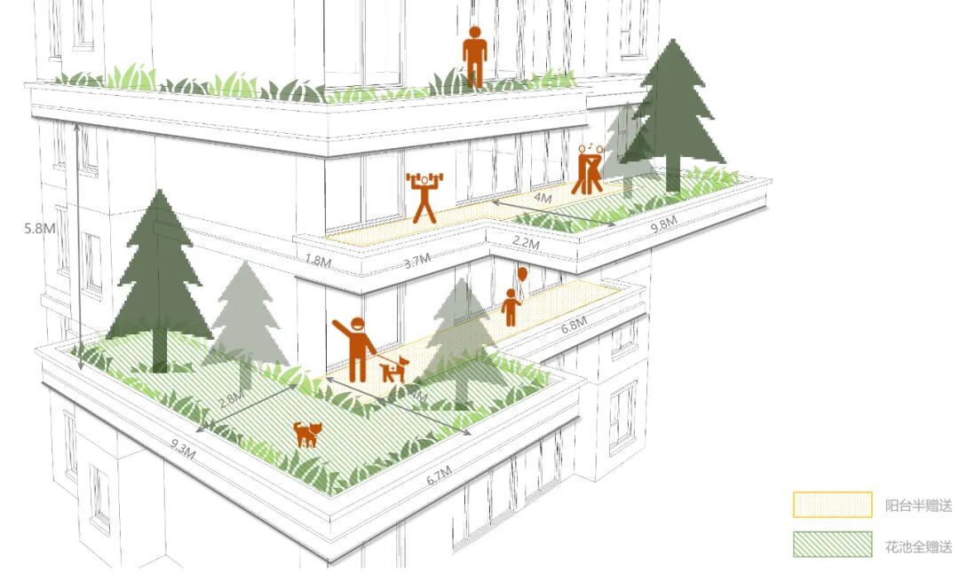 为满足空中庭院能够满足高大乔木以及多品种灌木的种植要求,露台较为理想的就是方正的形式,既要有横向延展性,也要有纵深,所以露台尺度上控制为约50㎡/户,进深最小为4.8m。