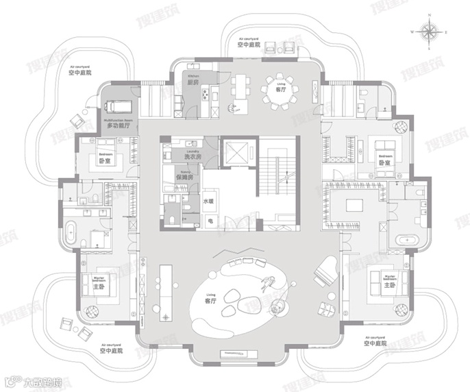 下面这个建筑面积约500-540㎡的户型,一层一户设计,被4个空中庭院包围。