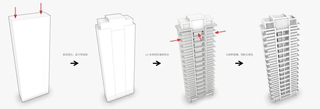 户型采用“凸”字型设计,将露台外伸,逐级旋转90度,错位向上布局,每三层一个模块,每三层一次循环,这样就形成了每户可拥有约9m挑高(三层高)的露台空间。