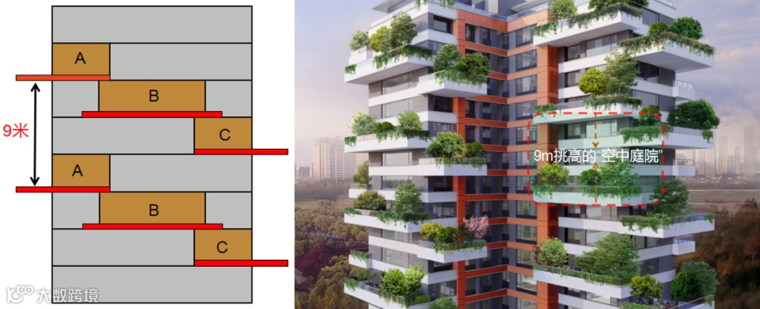 露台逐级错位向上,每三层一个模块,每三层一次循环,约9m挑高“空中庭院”,能满足大型乔木和灌木生长。