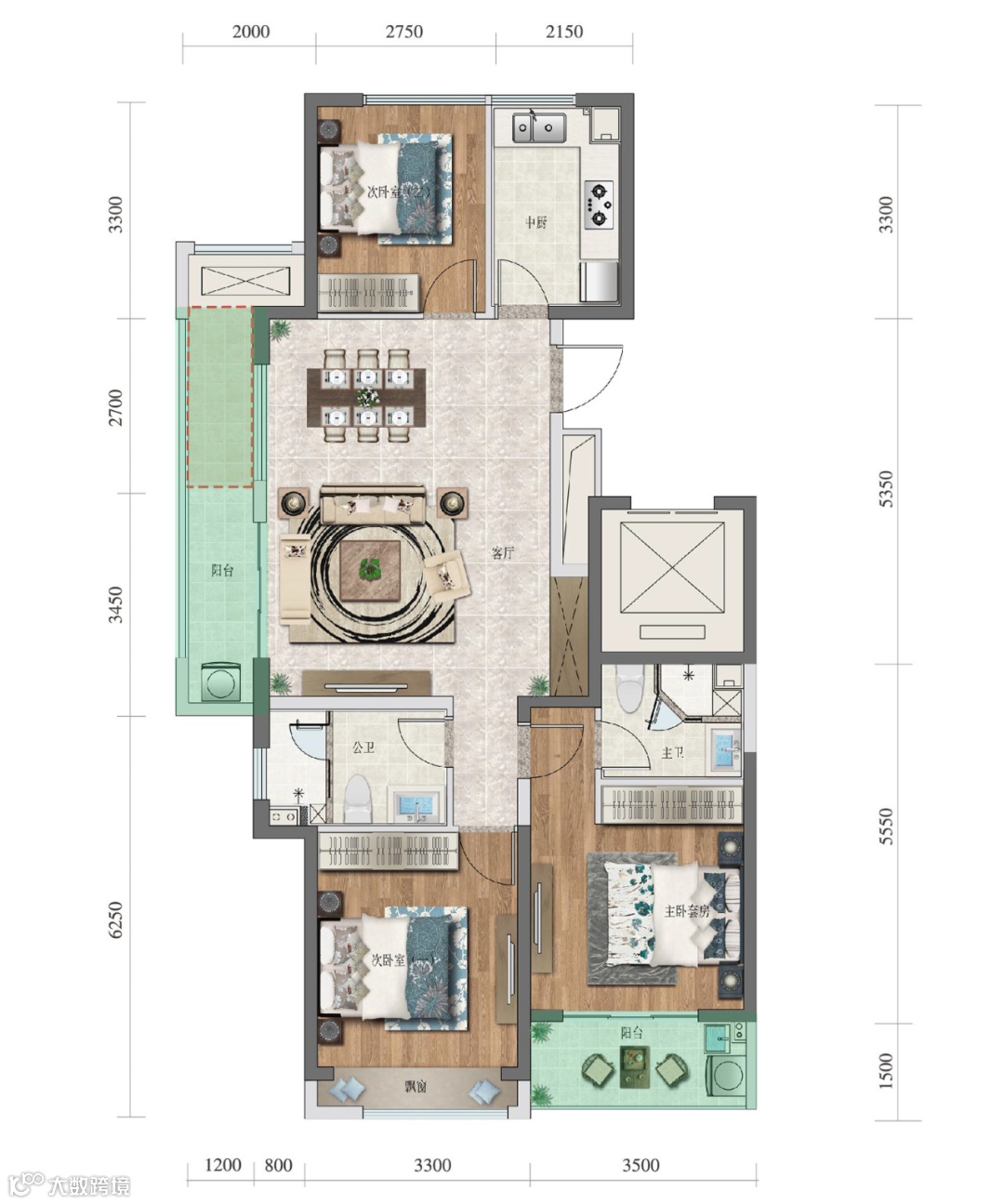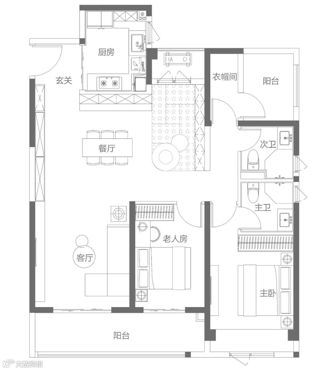 建面约125m²三室两厅两卫户型