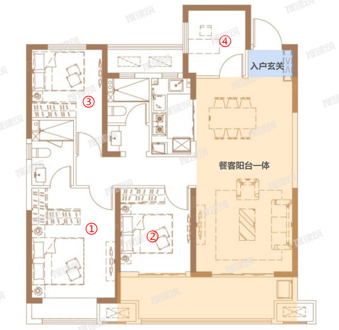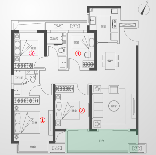 建筑面积约124平米户型,做到了4个卧室,户型亮点:双联阳台,主卧超大飘窗,多面宽朝南。