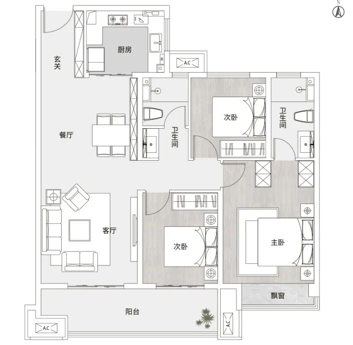 建筑面积约128㎡户型,4房2厅2卫,全明南北通透四房格局,三开间朝南设计,约5.8*1.8米双联大阳台,三段式干湿分离卫生间,兼顾私密与便捷。