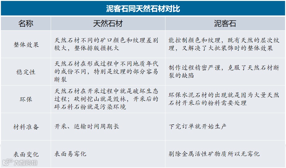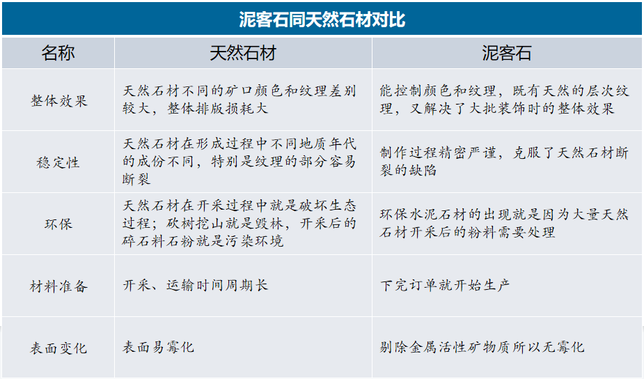 泥客石同人造石、天然石材对比,亦具有天然的优越性。