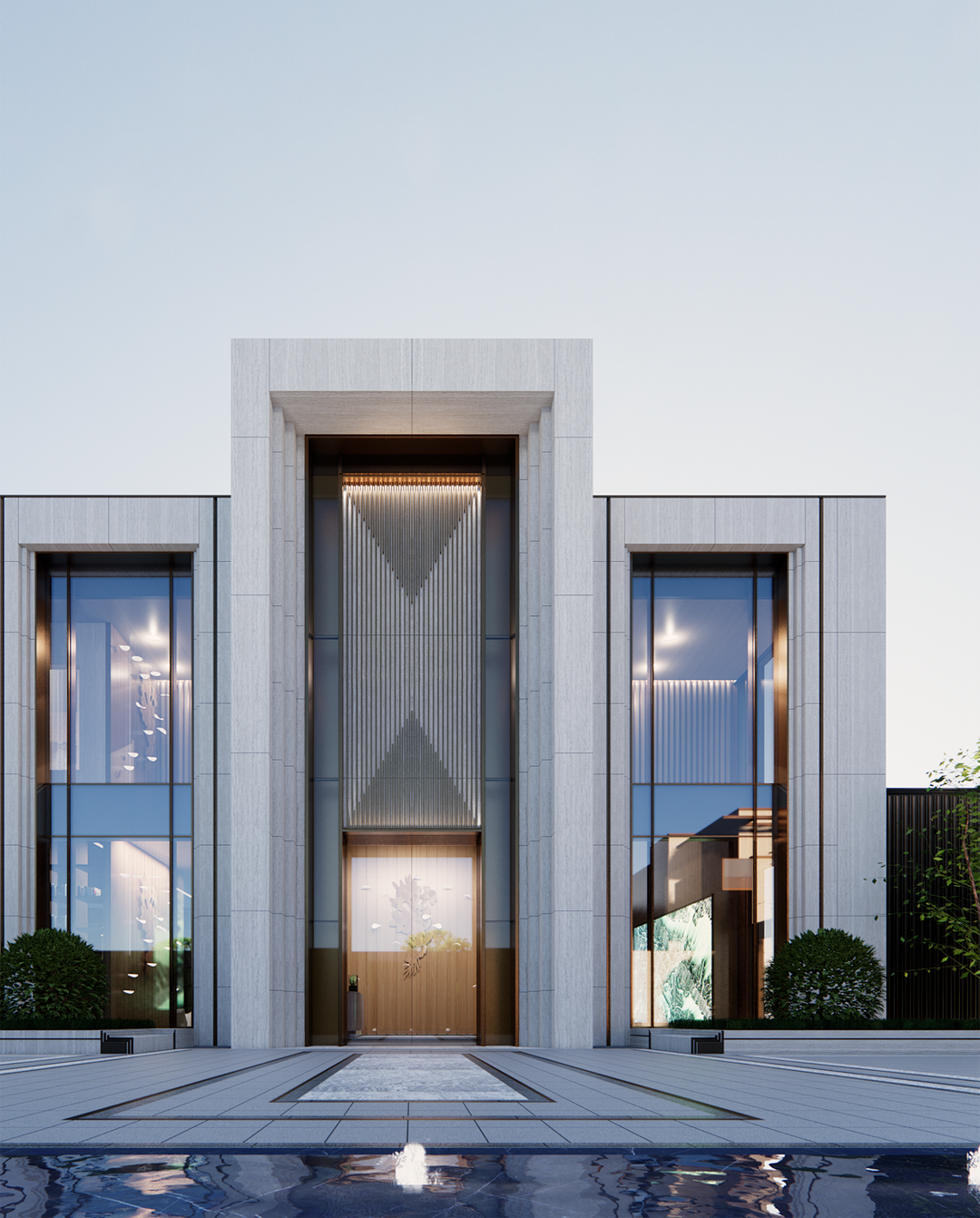 中山保利・天珺花园展示中心,设计在极简玻璃盒子的基础上,增加仿石材的使用,强调水平感,平衡玻璃给人带来的不稳定性。建筑立面由高透玻璃与米白色水泥浇筑板构成,勾勒出建筑体量,通过虚实,展现建筑之美。其中,泥客石作为一种创新型仿石材,是具有天然石材肌理的水泥浇筑板,表面质感强烈、纹理独特,符合现代风格建筑的特点。材料尺寸最大做到1200×2400mm,板材尺寸大,立面材料缝隙少,易达到纯净的效果。