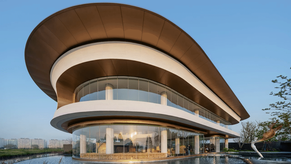 绍兴祥生雅居乐 · 鉴湖明樾展示馆,外墙选用米白色泥客石结合香槟色铝板实现二维曲面造型设计,室内外一体化设计,沿湖展开面嵌入无框无肋无边的超白高透玻璃,体现“轻透”而富有雕塑感的“漂浮的盒子”形象。